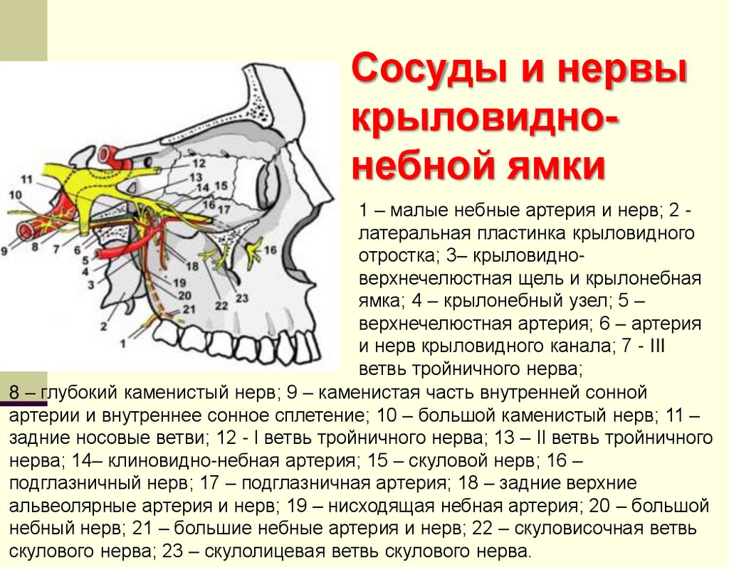 нерва; 14– клиновидно-небная артерия; 15 – скуловой нерв; 16 –