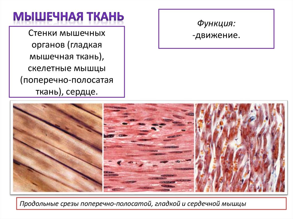 Продольные срезы поперечно-полосатой, гладкой и сердечной мышцы