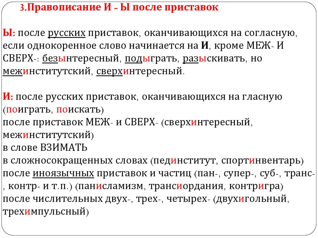 3.Правописание И - Ы после приставокЫ: после русских приставок, оканчивающихся на согласную,