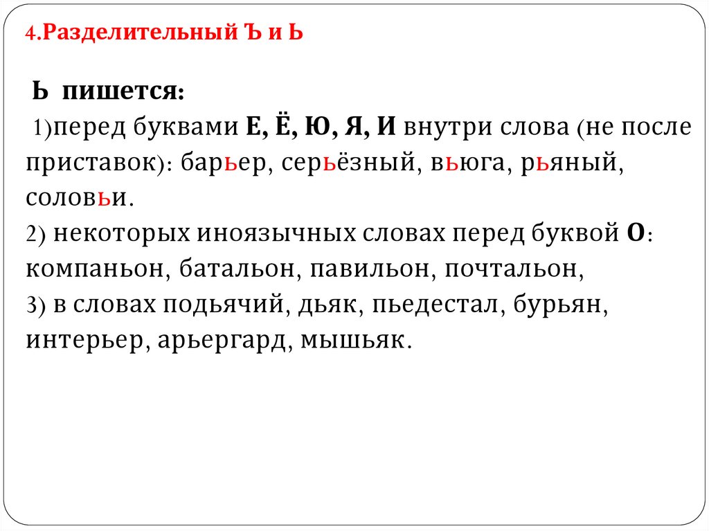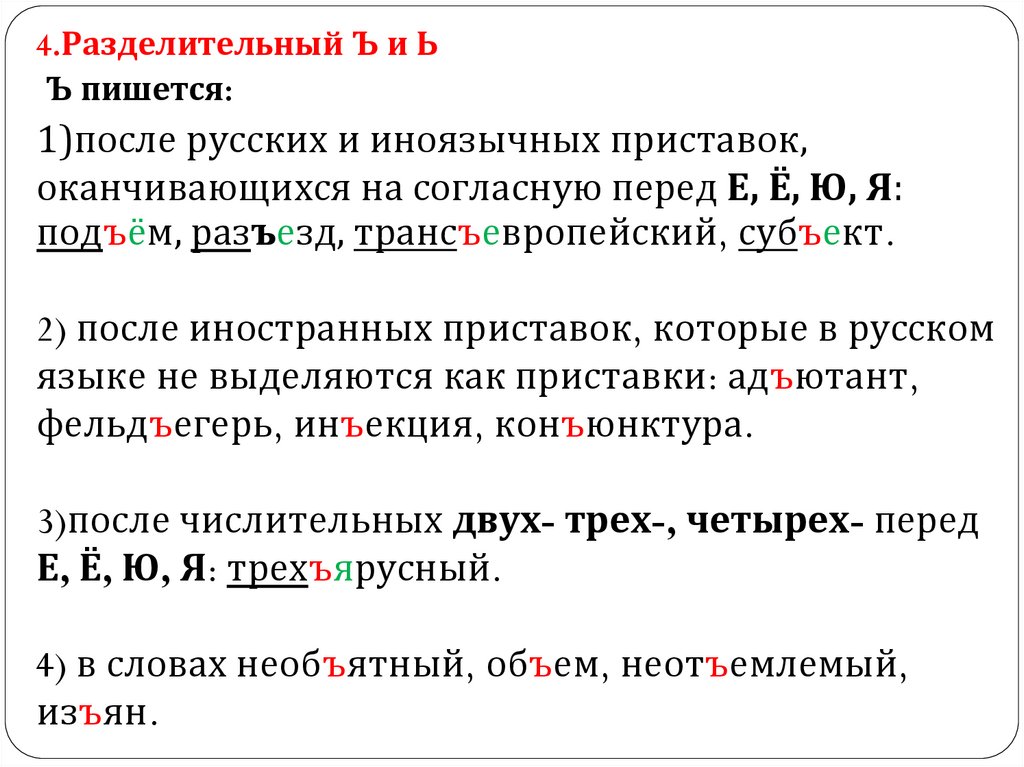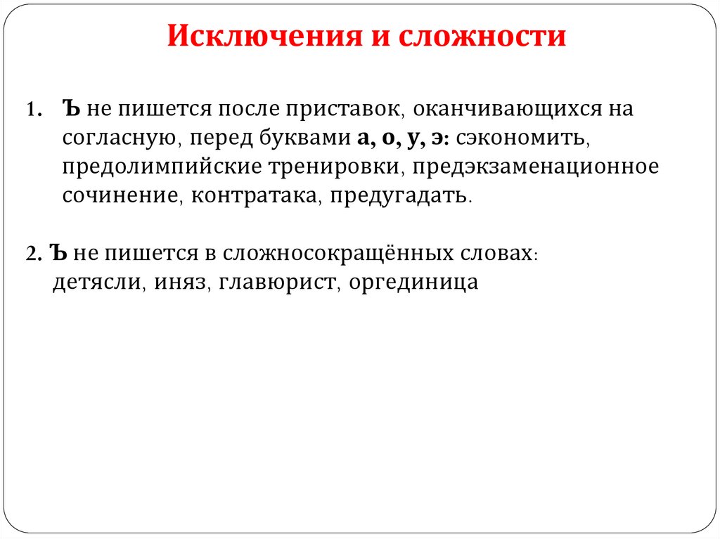 Исключения и сложности1. Ъ не пишется после приставок, оканчивающихся на