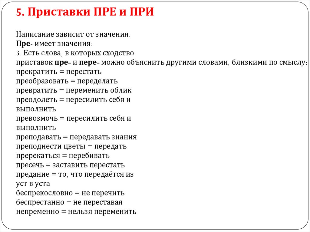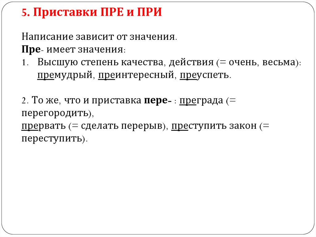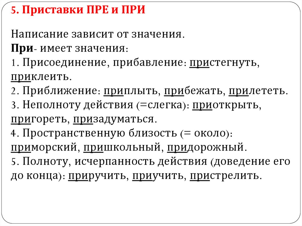 5. Приставки ПРЕ и ПРИНаписание зависит от значения.