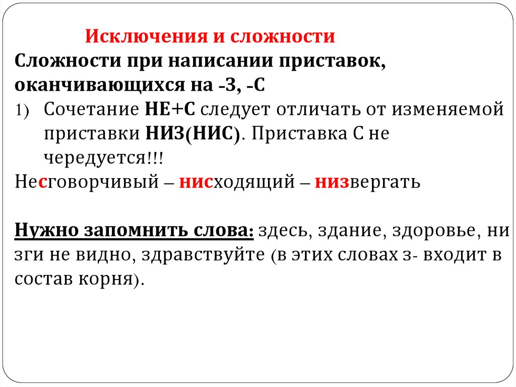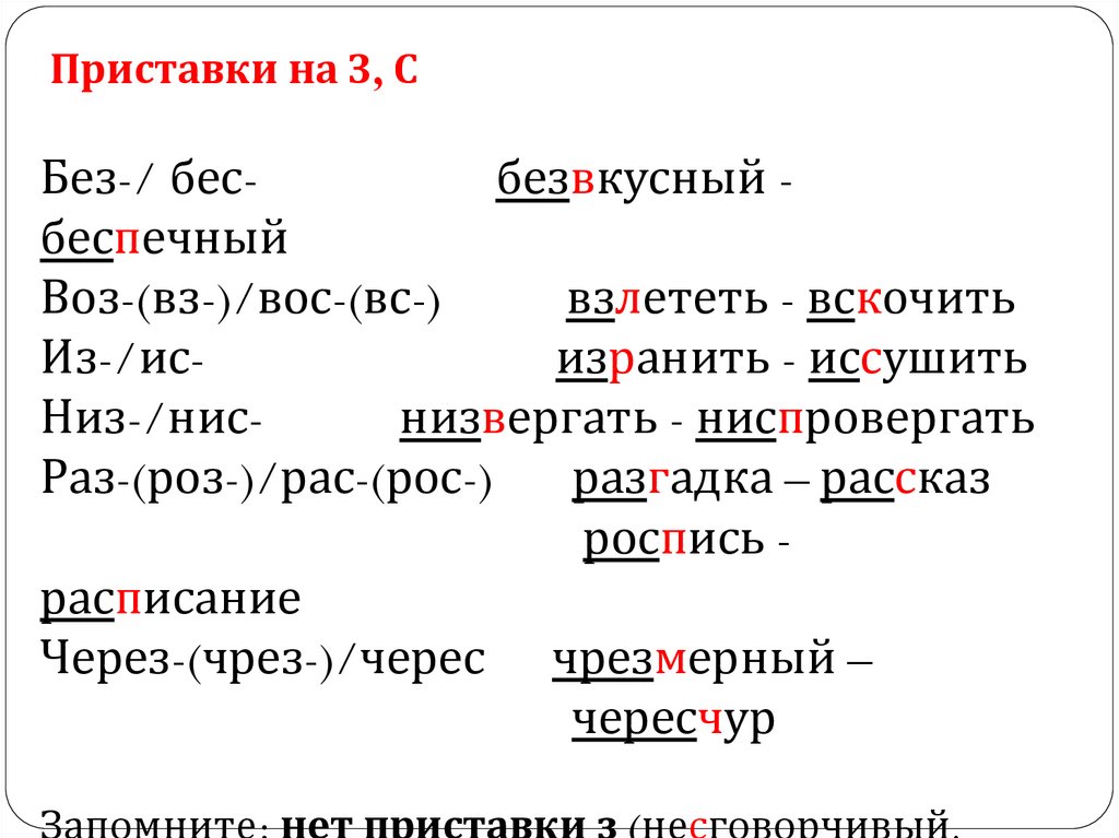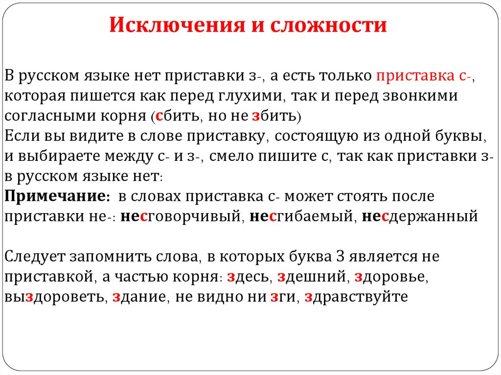 Исключения и сложностиВ русском языке нет приставки з-, а есть только приставка с-,