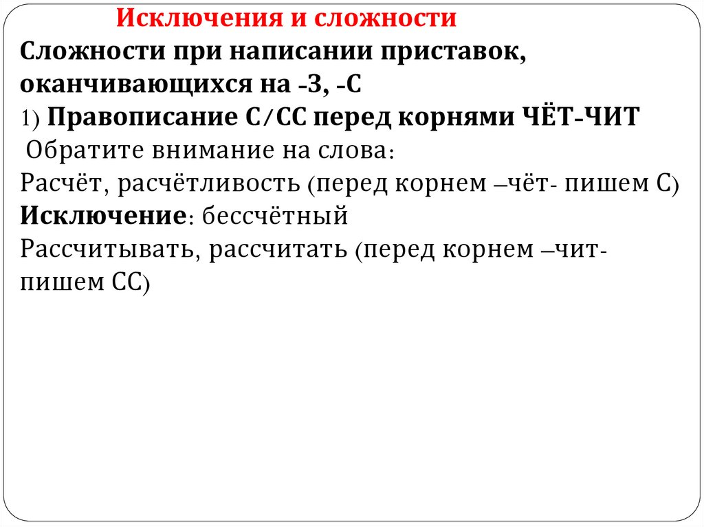 1) Правописание С/СС перед корнями ЧЁТ-ЧИТ