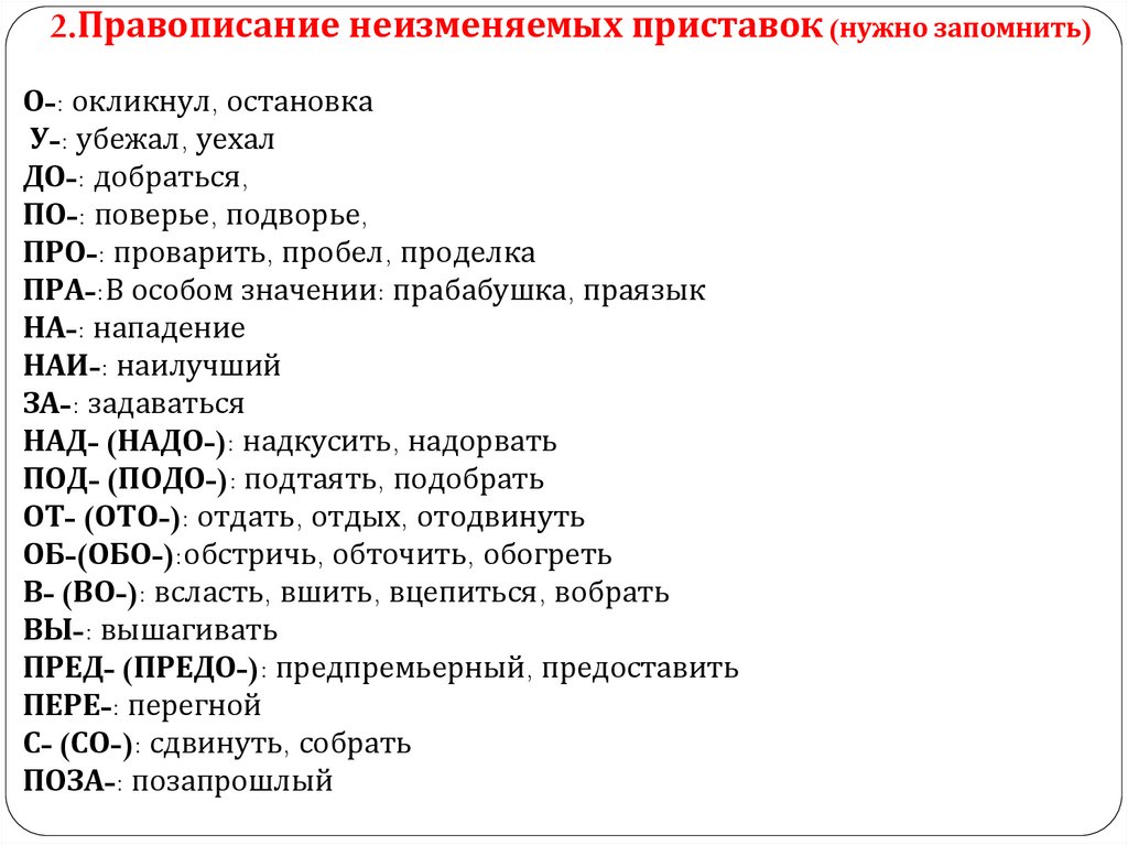 2.Правописание неизменяемых приставок (нужно запомнить)О-: окликнул, остановка