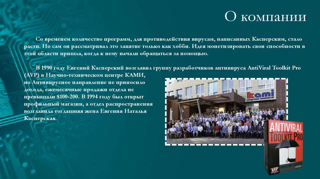 О компанииСо временем количество программ, для противодействия вирусам, написанных Касперским, стало