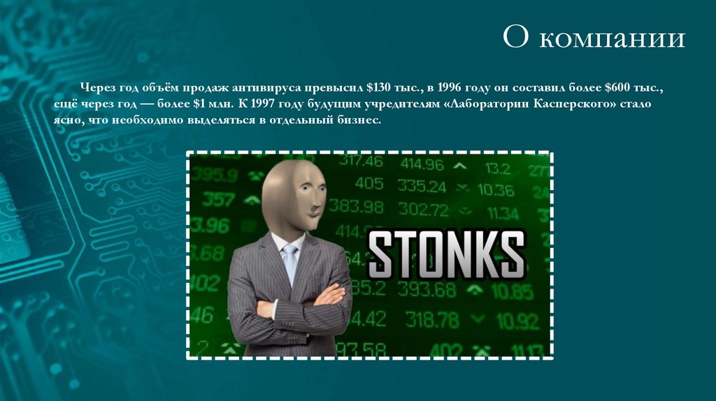 О компанииЧерез год объём продаж антивируса превысил $130 тыс., в 1996 году он составил более $600 тыс.,