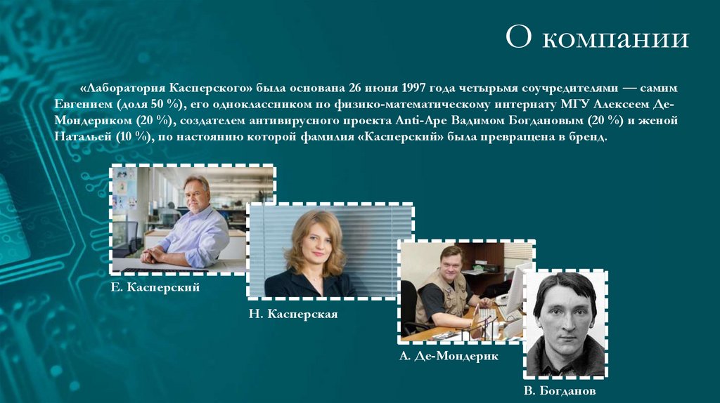 О компании«Лаборатория Касперского» была основана 26 июня 1997 года четырьмя соучредителями — самим