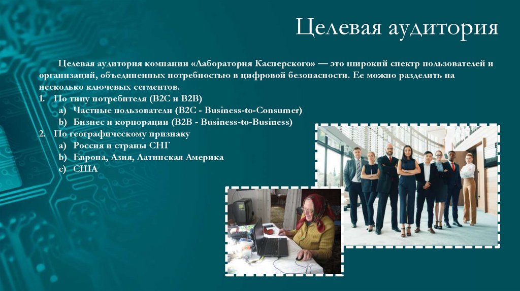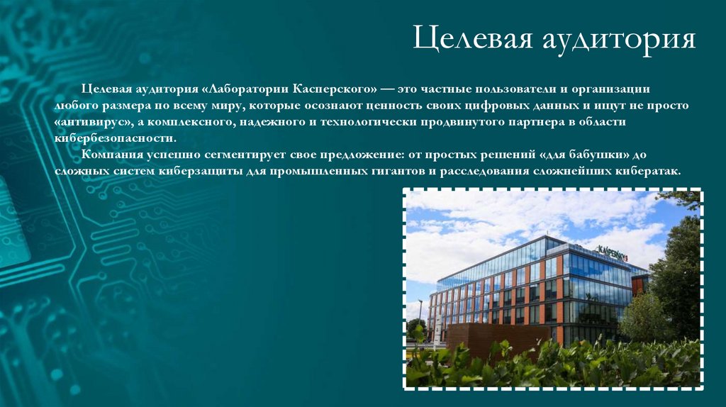 Целевая аудиторияЦелевая аудитория «Лаборатории Касперского» — это частные пользователи и организации