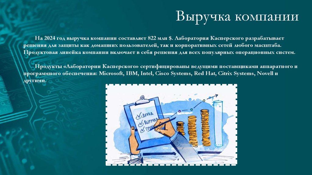 Выручка компанииНа 2024 год выручка компании составляет 822 млн $. Лаборатория Касперского разрабатывает