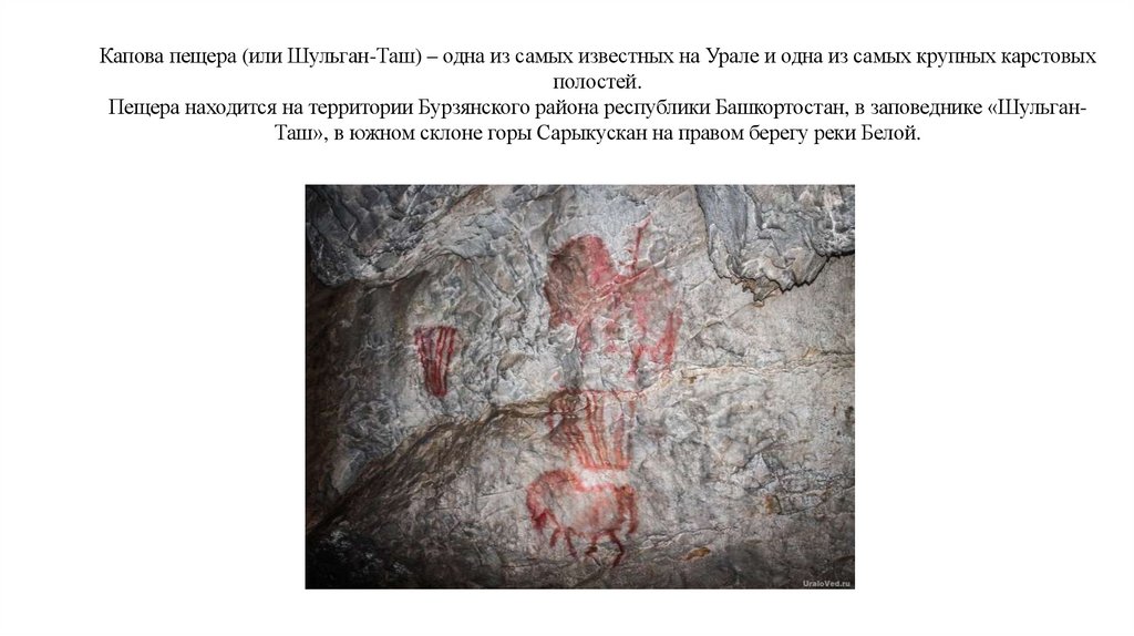 Капова пещера (или Шульган-Таш) – одна из самых известных на Урале и одна из самых крупных карстовыхполостей.