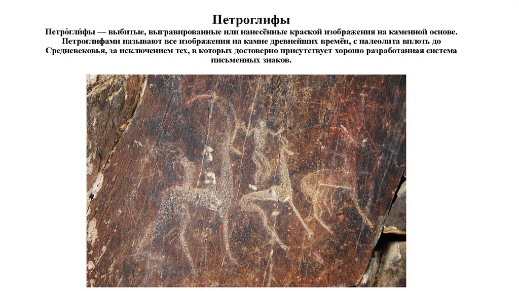 ПетроглифыПетро́гли́фы — выбитые, выгравированные или нанесённые краской изображения на каменной основе.
