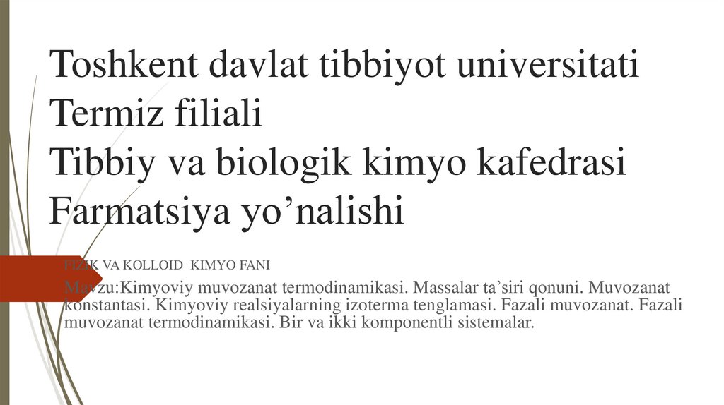 FIZIK VA KOLLOID KIMYO FANIMavzu:Kimyoviy muvozanat termodinamikasi. Massalar ta’siri qonuni. Muvozanat