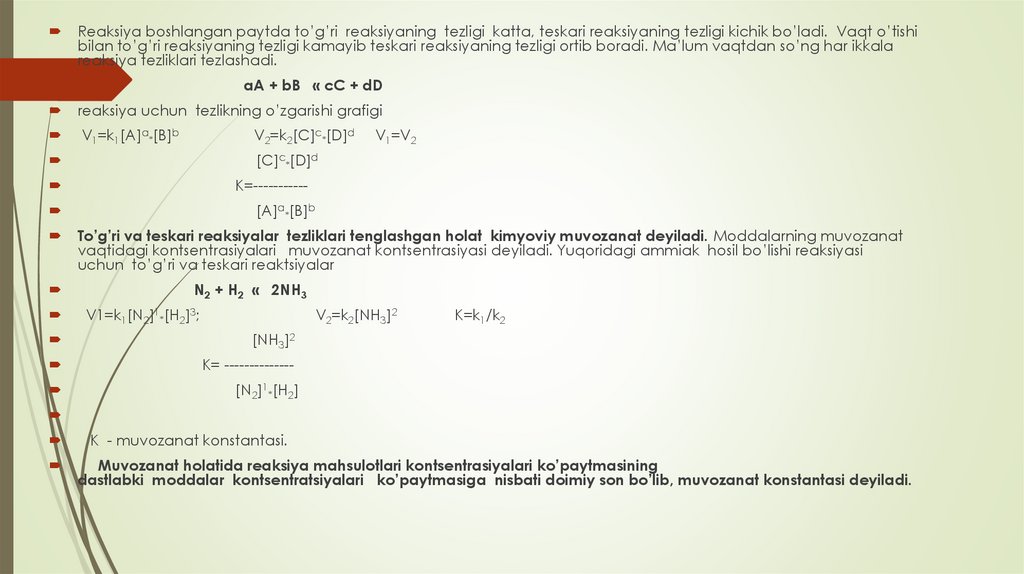 konsentratsiyasi orttirilsa, shu modda ishtirokida o‘ng tomonga boradigan reaksiya tezligi ortadi, ya’ni qo‘shilgan modda konsentratsiyasini