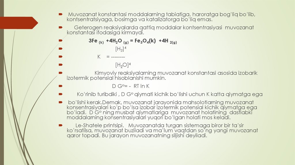 birining konsentratsiyasi о‘zgartirilsa), muvozanat shu ta’sirni kamaytiruvchi reaksiya tomon siljiydi.