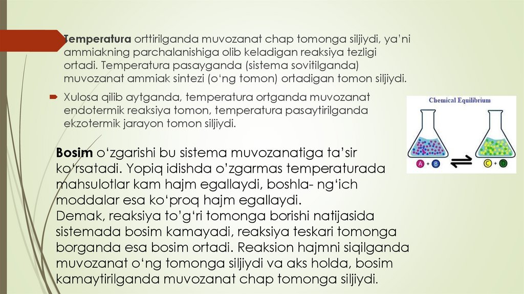 Temperatura orttirilganda muvozanat chap tomonga siljiydi, ya’niammiakning parchalanishiga olib keladigan reaksiya tezligi