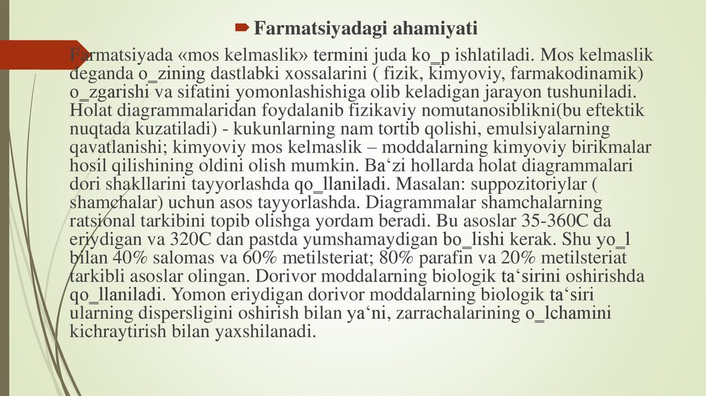 Farmatsiyadagi ahamiyatiFarmatsiyada «mos kelmaslik» termini juda ko‗p ishlatiladi. Mos kelmaslik