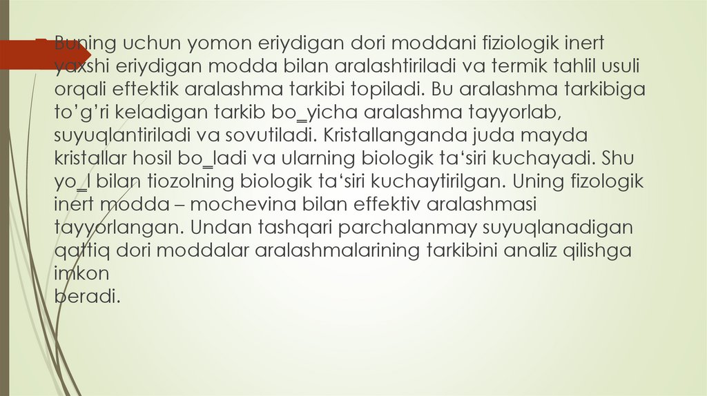Buning uchun yomon eriydigan dori moddani fiziologik inertyaxshi eriydigan modda bilan aralashtiriladi va termik tahlil usuli