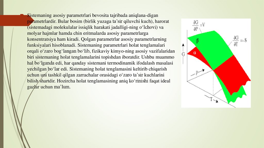 Agar holat tenglamasi ma’lum bo‘lsa, indivi-dual moddaningxossalarini ifodalash uchun ikkita parametrning qiymatlarini bilish