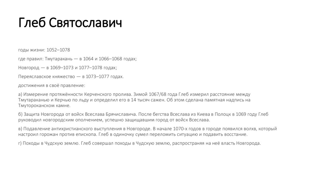 г) Походы в Чудскую землю. Глеб совершал походы в Чудскую землю, распространяя на неё власть Новгорода.