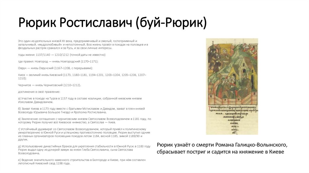 Рюрик Ростиславич (буй-Рюрик)Это один из деятельных князей XII века, предприимчивый и смелый, гостеприимный и