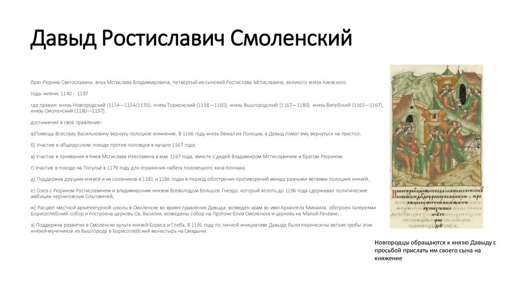 ж) Расцвет местной архитектурной школы в Смоленске во время правления Давыда: возведён храм во имя Архангела Михаила, обстроен галереями