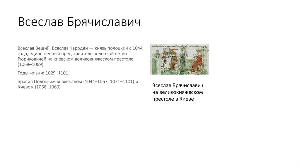 Всеслав БрячиславичВсеслав Вещий, Всеслав Чародей — князь полоцкий с 1044