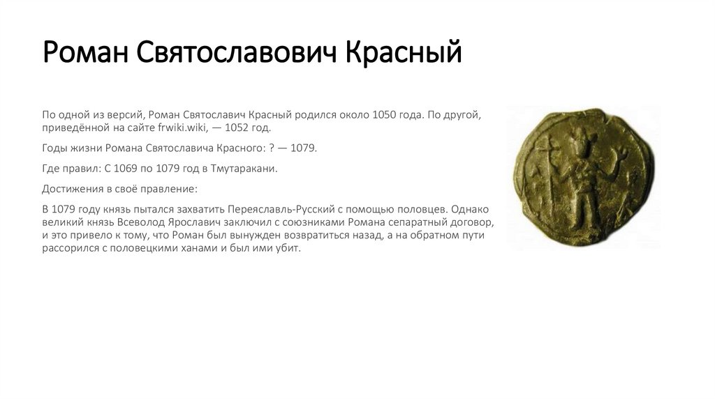 Годы жизни Романа Святославича Красного: ? — 1079.