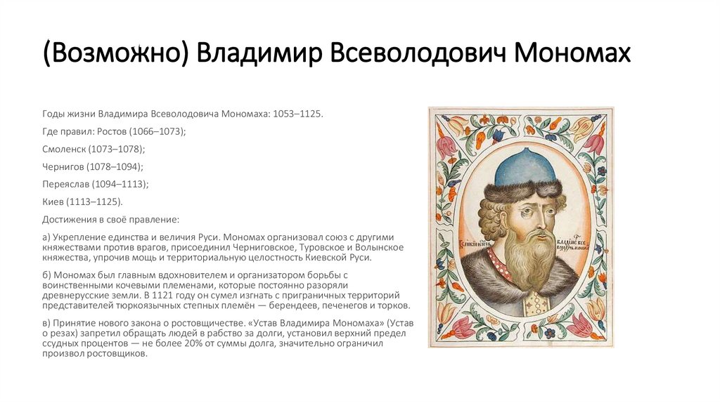 (Возможно) Владимир Всеволодович МономахГоды жизни Владимира Всеволодовича Мономаха: 1053–1125.