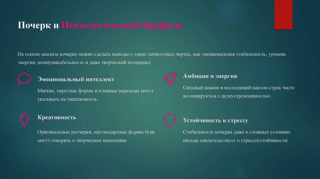 Почерк и Психологический ПрофильНа основе анализа почерка можно сделать выводы о таких личностных чертах, как эмоциональная стабильность, уровень