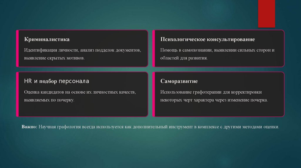 Важно: Научная графология всегда используется как дополнительный инструмент в комплексе с другими методами оценки.