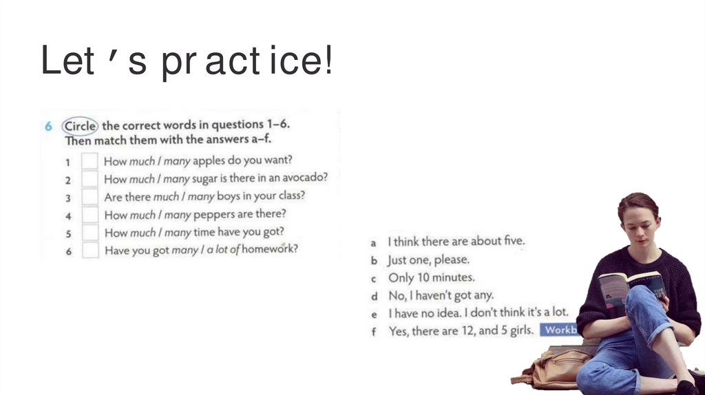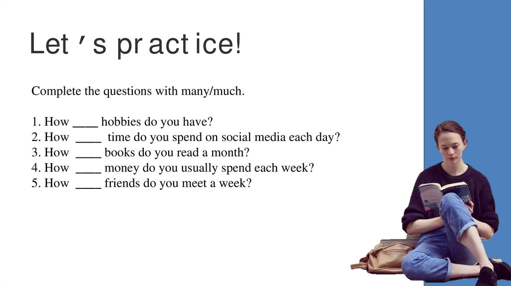Let’s practice!Complete the questions with many/much.
