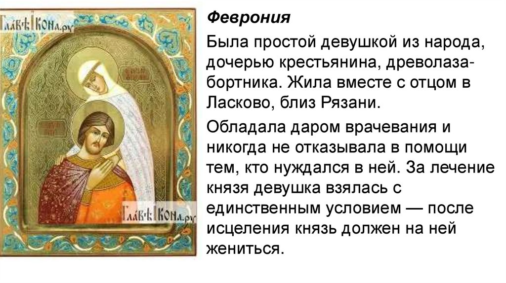 Февронии. Она снова согласилась его исцелить, если он на ней женится. Петр дал слово, и Феврония