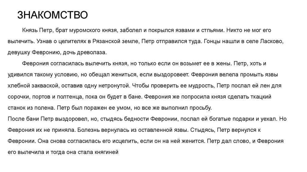 ЗНАКОМСТВОКнязь Петр, брат муромского князя, заболел и покрылся язвами и стпьями. Никто не мог его