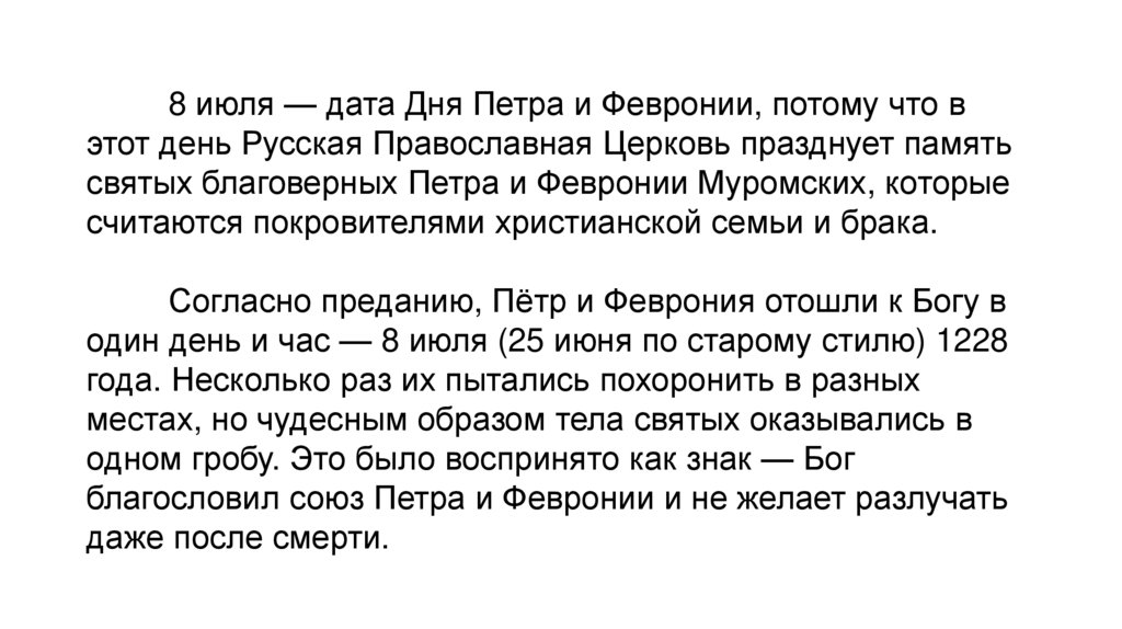8 июля — дата Дня Петра и Февронии, потому что вэтот день Русская Православная Церковь празднует память