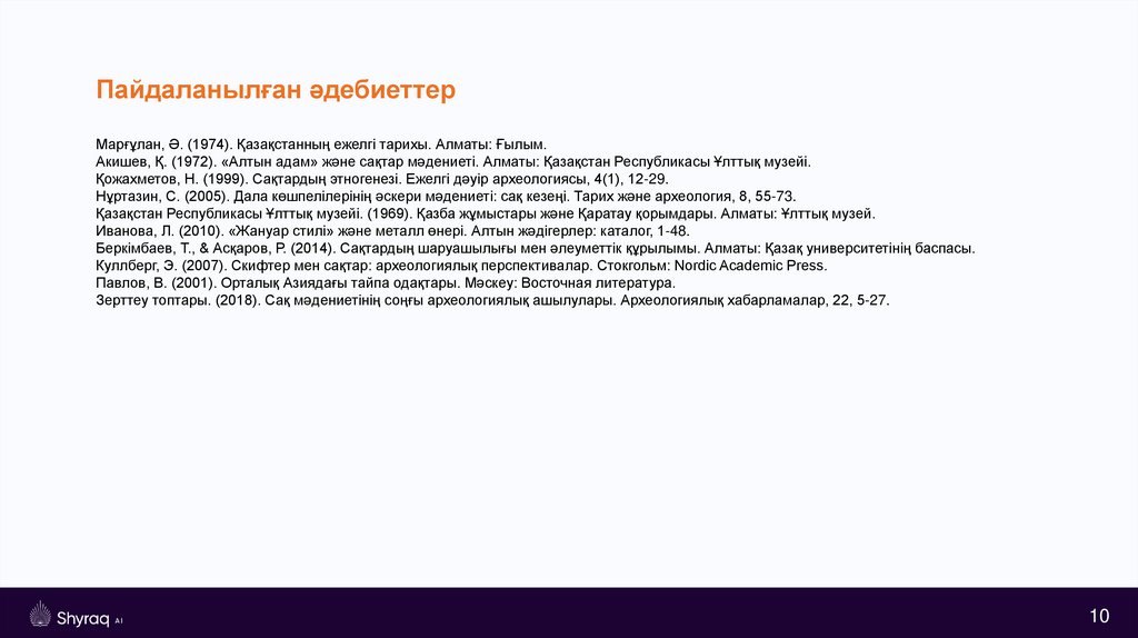 Пайдаланылған әдебиеттерМарғұлан, Ә. (1974). Қазақстанның ежелгі тарихы. Алматы: Ғылым.