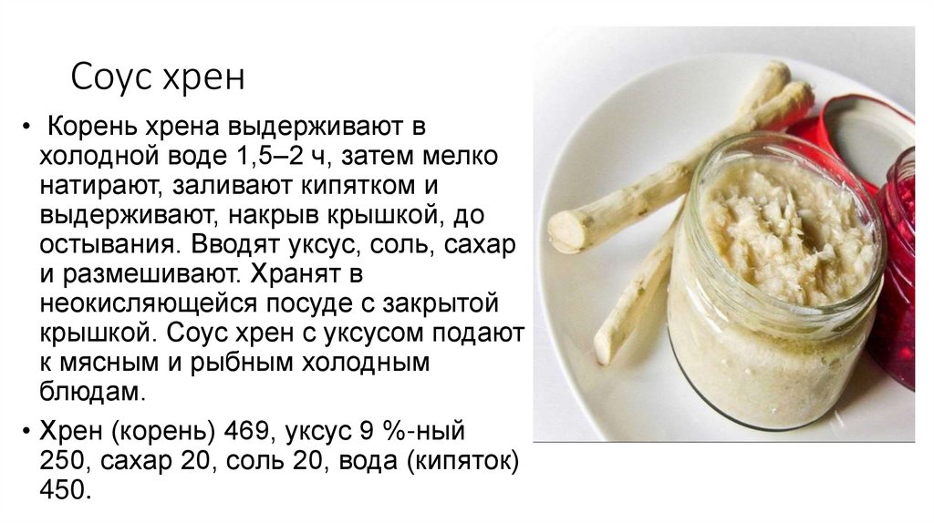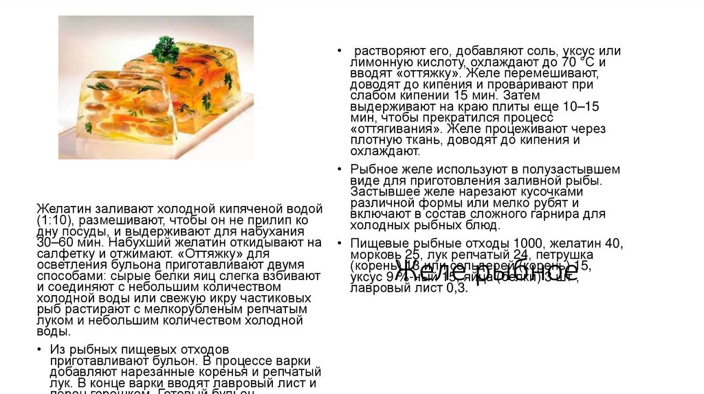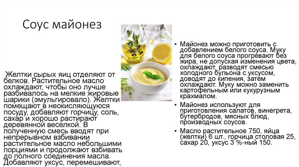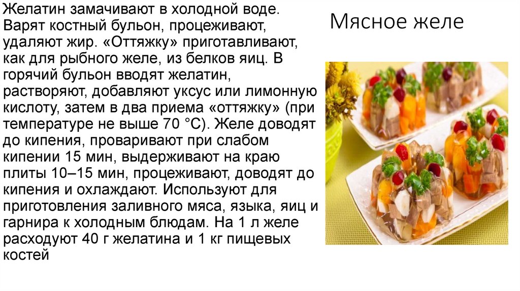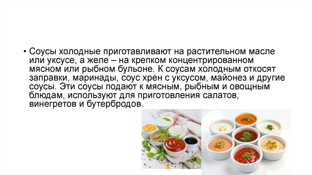 • Соусы холодные приготавливают на растительном маслеили уксусе, а желе – на крепком концентрированном