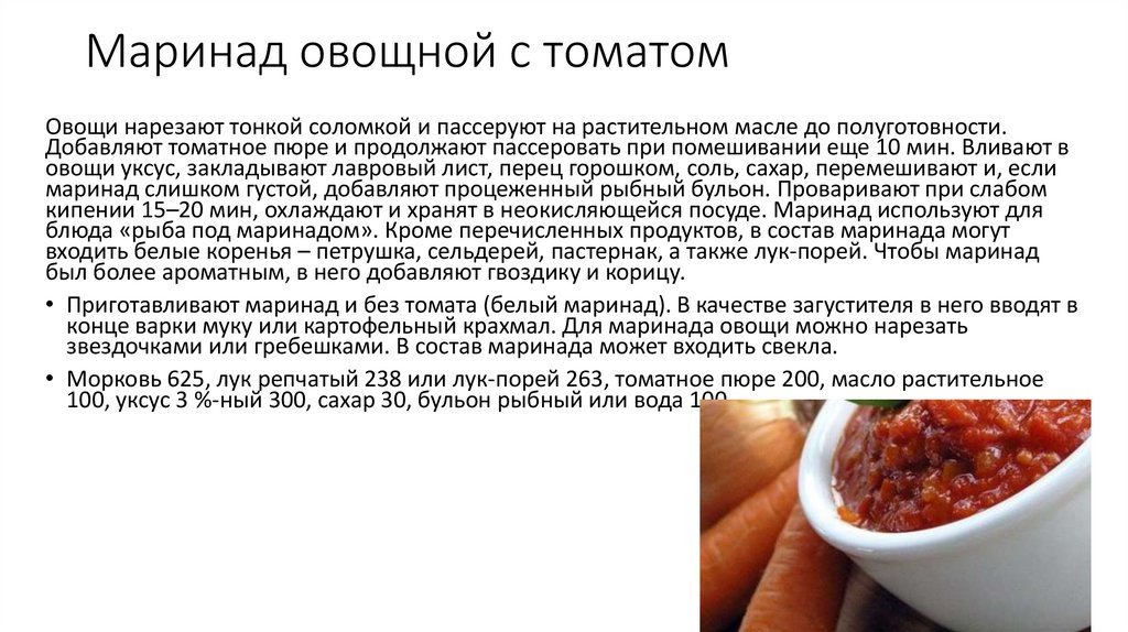 Маринад овощной с томатомОвощи нарезают тонкой соломкой и пассеруют на растительном масле до полуготовности.