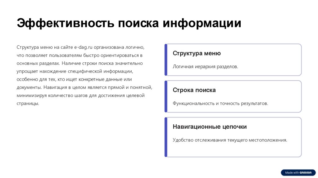 Эффективность поиска информацииСтруктура меню на сайте e-dag.ru организована логично,