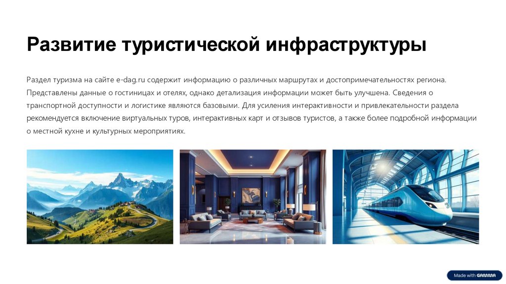 Развитие туристической инфраструктурыРаздел туризма на сайте e-dag.ru содержит информацию о различных маршрутах и достопримечательностях региона.