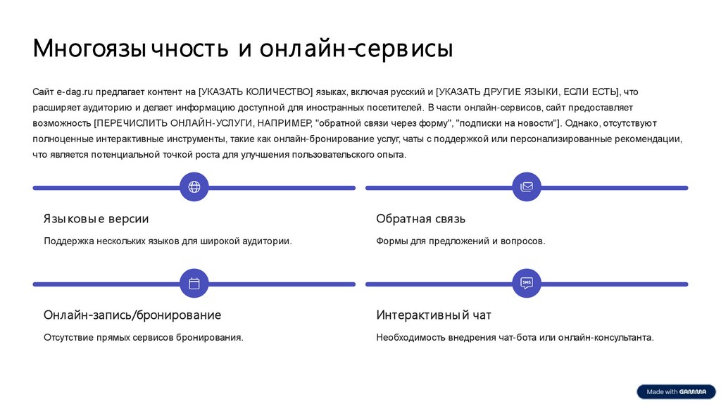 Многоязы чность и онл айн-серв исыСайт e-dag.ru предлагает контент на [УКАЗАТЬ КОЛИЧЕСТВО] языках, включая русский и [УКАЗАТЬ ДРУГИЕ ЯЗЫКИ, ЕСЛИ ЕСТЬ], что