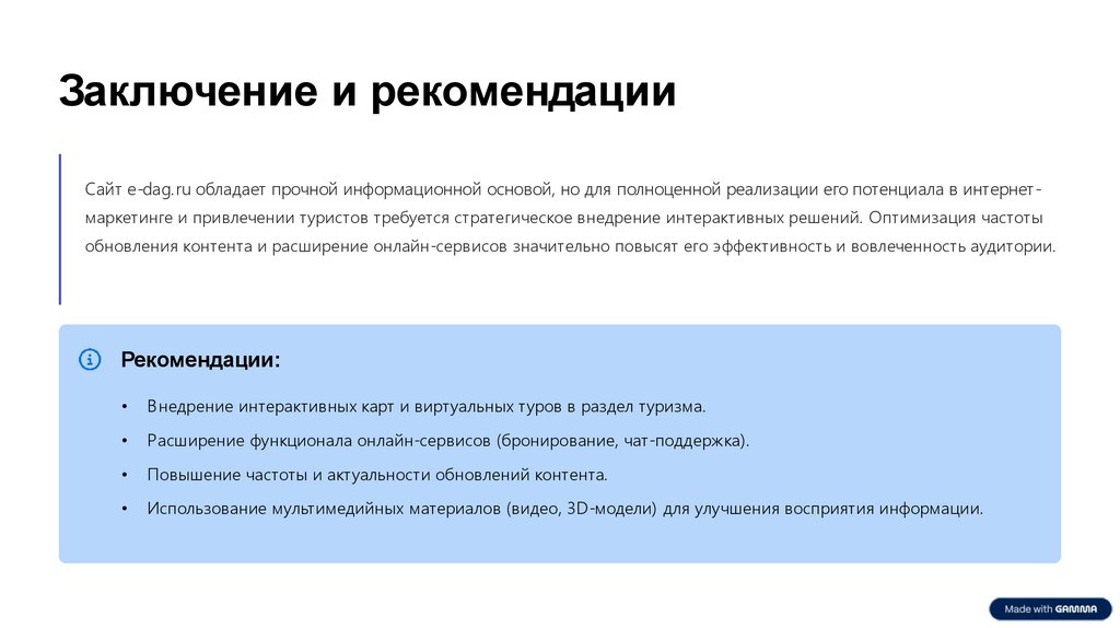 Заключение и рекомендацииСайт e-dag.ru обладает прочной информационной основой, но для полноценной реализации его потенциала в интернетмаркетинге и привлечении туристов требуется стратегическое внедрение интерактивных решений. Оптимизация частоты