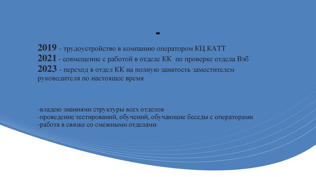 2019 - трудоустройство в компанию оператором КЦ КАТТ2021 - совмещение с работой в отделе КК по проверке отдела Вэб