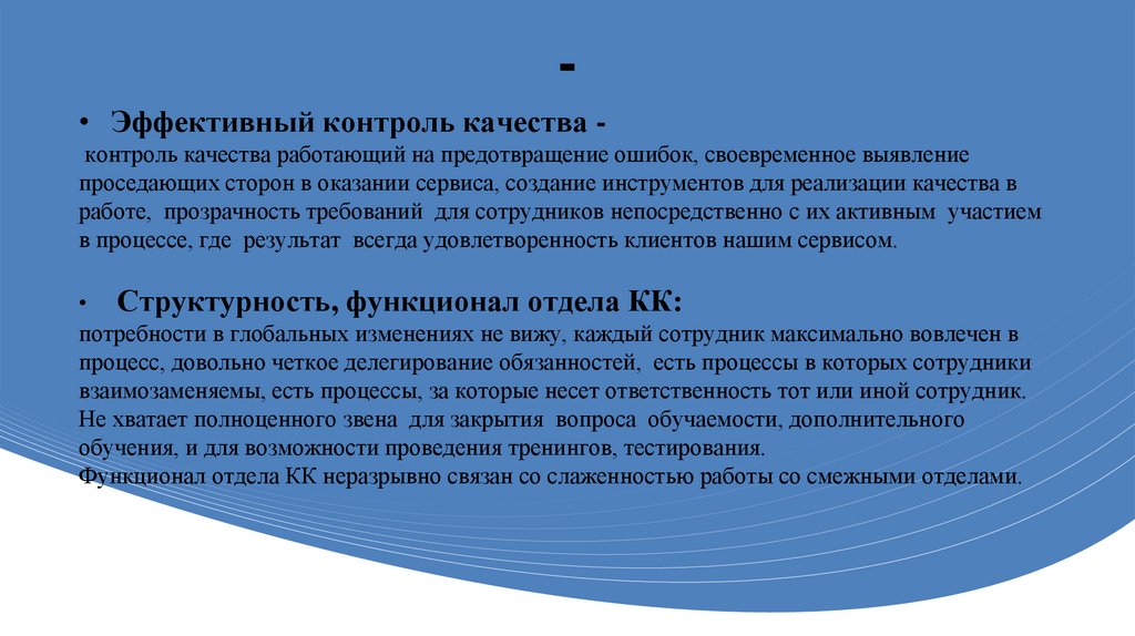 • Эффективный контроль качества контроль качества работающий на предотвращение ошибок, своевременное выявлениепроседающих сторон в оказании сервиса, создание инструментов для реализации качества в