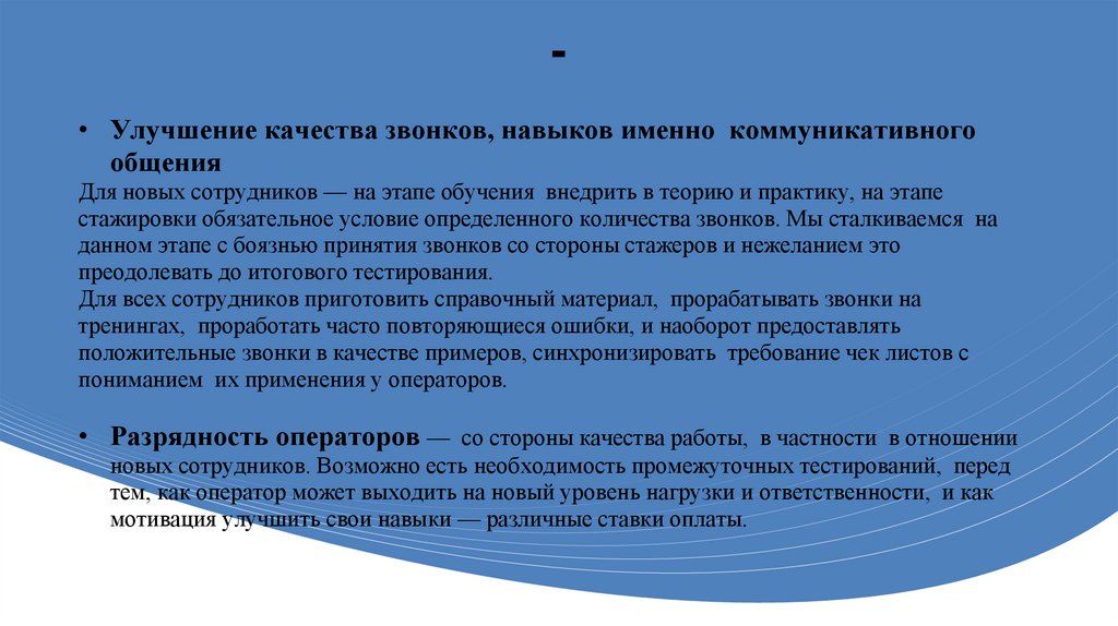 • Улучшение качества звонков, навыков именно коммуникативногообщения