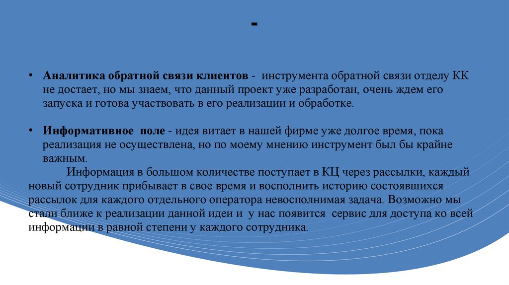 • Аналитика обратной связи клиентов - инструмента обратной связи отделу ККне достает, но мы знаем, что данный проект уже разработан, очень ждем его