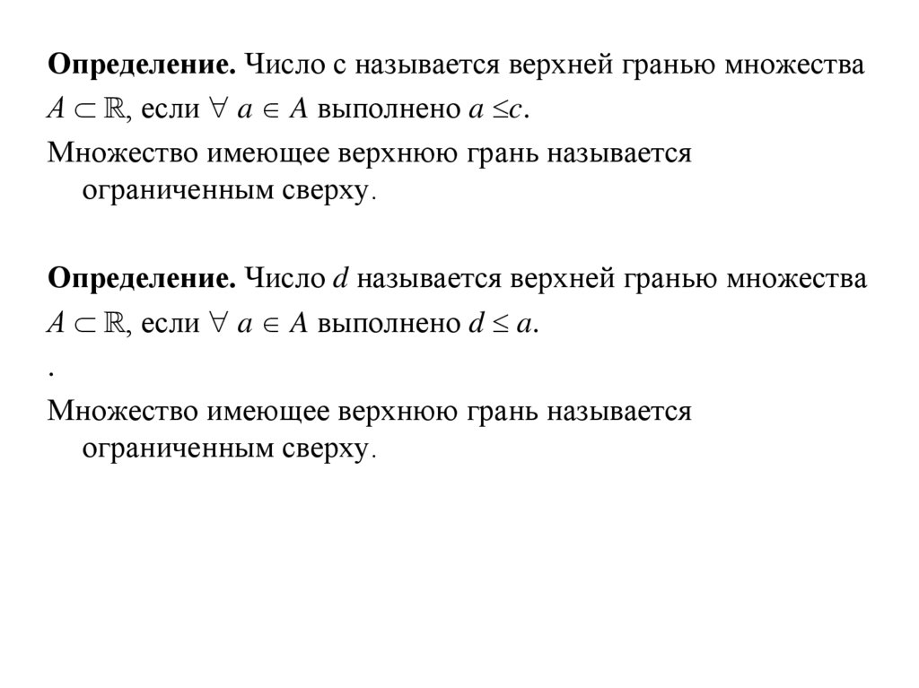 Определение. Число с называется верхней гранью множестваА ℝ, если a A выполнено a c.
