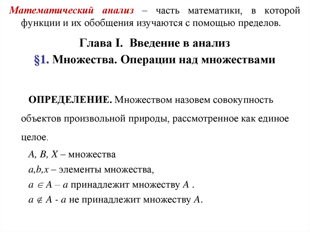 Математический анализ – часть математики, в которойфункции и их обобщения изучаются с помощью пределов.