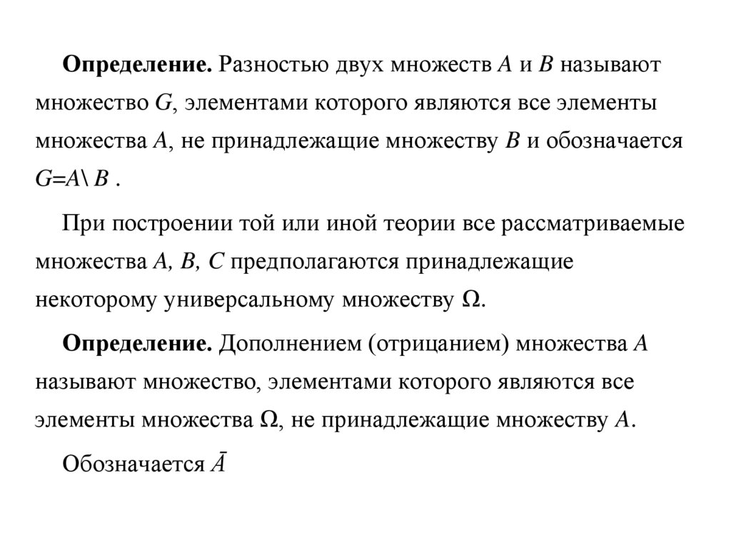 Определение. Разностью двух множеств A и B называютмножество G, элементами которого являются все элементы
