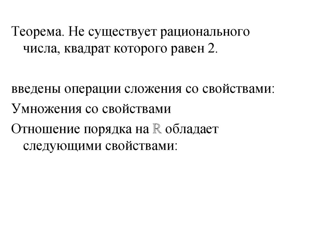 Теорема. Не существует рациональногочисла, квадрат которого равен 2.