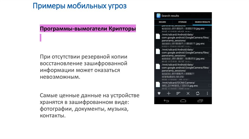 Примеры мобильных угрозПрограммы-вымогатели Крипторы